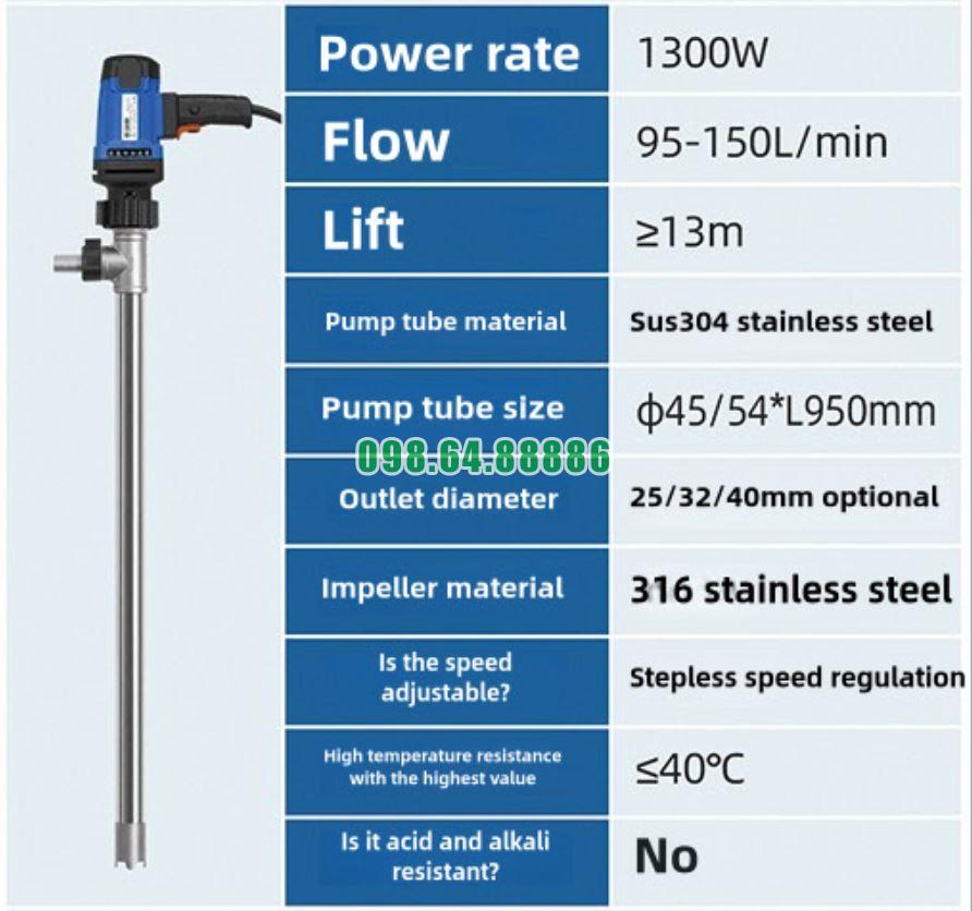 Trong lĩnh vực hóa chất, yêu cầu đối với thiết bị bơm luôn khắt khe hơn nhiều ngành khác do đặc tính ăn mòn, độc hại và rủi ro cao khi thao tác. Bơm điện thùng phuy JDT-1300W-304SUS được đánh giá là giải pháp hàng đầu cho hóa chất nhờ đáp ứng đồng thời các tiêu chí về vật liệu, an toàn vận hành, độ ổn định và hiệu quả sử dụng thực tế.
