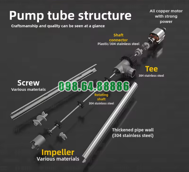 Máy sử dụng ống bơm và trục quay inox 304, kết hợp với cánh bơm inox SUS304 nguyên khối. Cấu tạo này giúp máy bền hơn khi làm việc với mực in có độ bám dính cao, đồng thời bảo đảm độ ổn định trong quá trình vận hành liên tục.