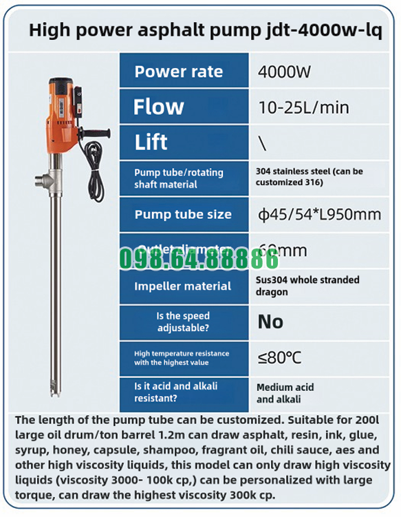 Bơm điện hút chất đặc từ thùng phuy JDT-4000W-LQ ứng dụng trong sản xuất mực in là giải pháp phù hợp cho các đơn vị cần xử lý mực in có độ nhớt cao. Với động cơ mạnh 4000W, cấu tạo inox bền chắc, khả năng hút trực tiếp từ thùng phuy và thiết kế phù hợp cho chất lỏng đặc, thiết bị này giúp quá trình cấp liệu và sang chiết mực in diễn ra hiệu quả, ổn định và chuyên nghiệp hơn.