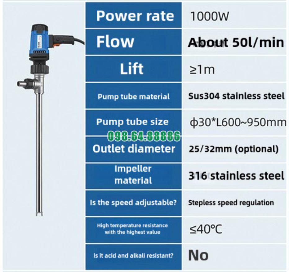Trong các quy trình công nghiệp, việc bơm chất lỏng ở nhiệt độ cao đòi hỏi thiết bị phải duy trì được độ ổn định cơ học, khả năng chịu nhiệt và kiểm soát dòng chảy hiệu quả. Bơm thùng phuy inox chịu nhiệt JDT-1300W-G260 được thiết kế chuyên biệt để đáp ứng yêu cầu này khi làm việc trực tiếp với các loại chất lỏng nóng.