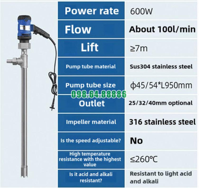 Bơm thùng phuy chịu nhiệt 260°C JDT-600W-G260