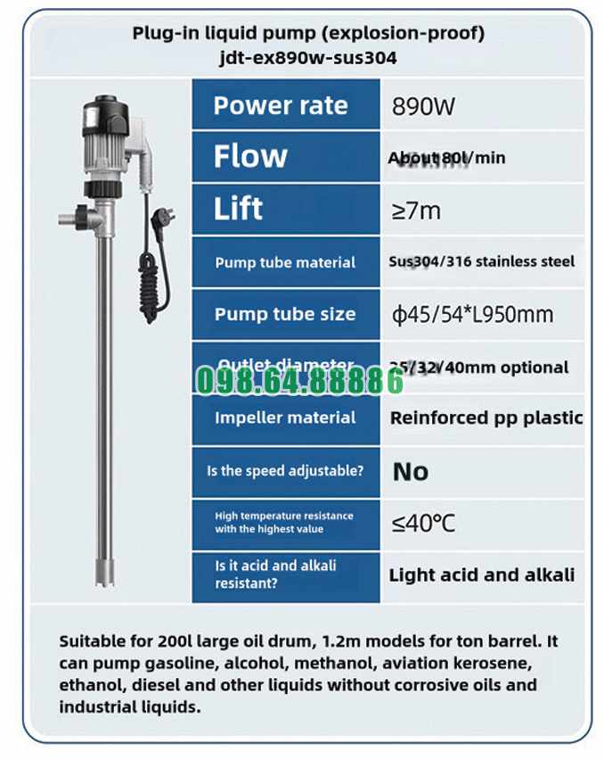 Nhờ thiết kế này, Máy bơm chất lỏng cắm trực tiếp chống cháy nổ JDT-EX890W-SUS304 có thể sử dụng linh hoạt giữa nhiều thùng chứa khác nhau.