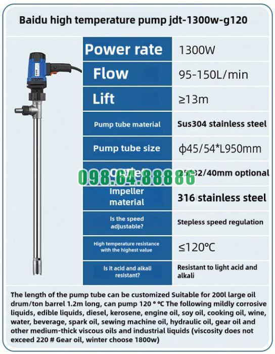 Bơm thùng phuy nhiệt độ cao JDT-1300W-G120 có thể: